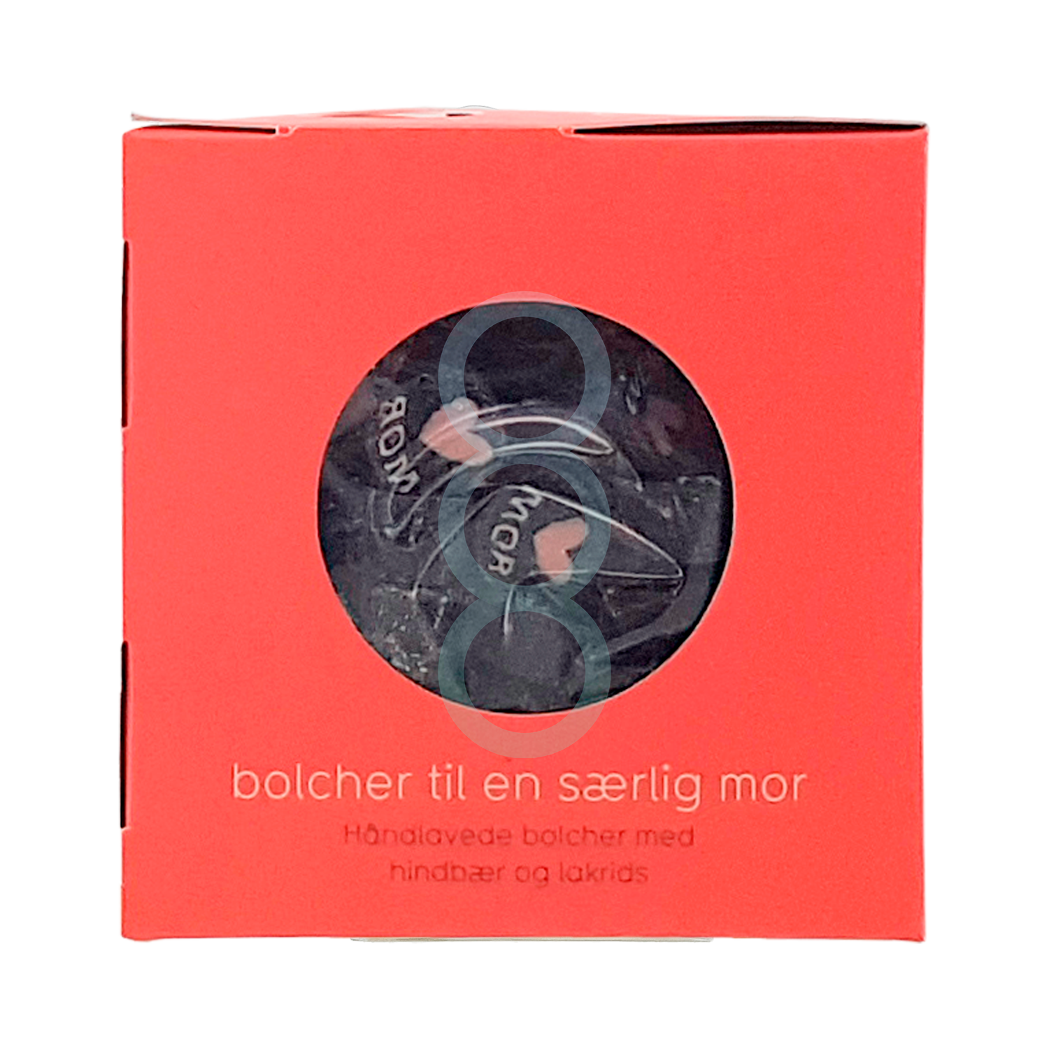 Gule bolcher med rød yderside hvor der står "Mor" inden i.