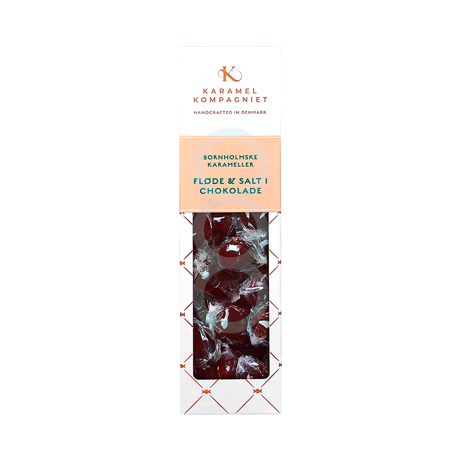 Rund og blød flødekaramel med sprøde saltkrystaller fra Læsø Sydesalt, overtrukket med mørk chokolade. En ægte gourmet oplevelse.