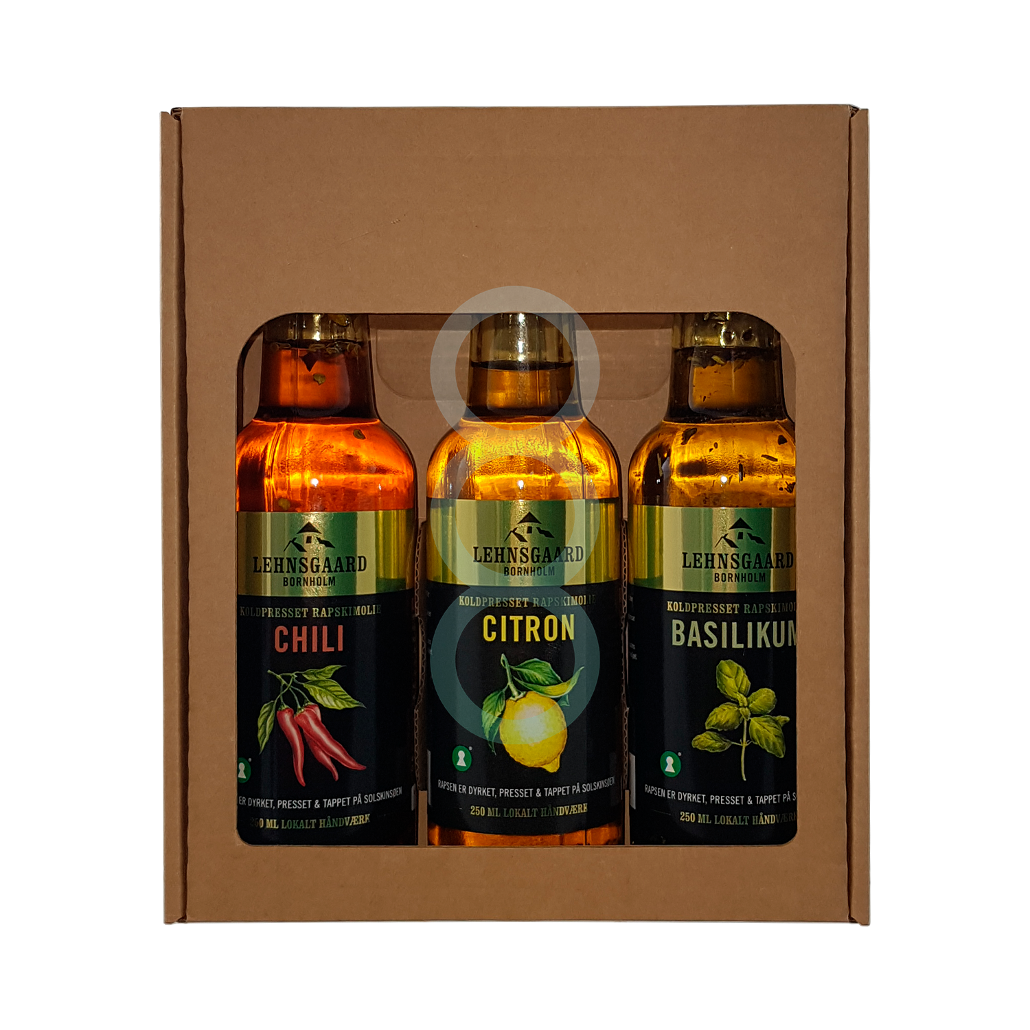 Billedet indeholder en sød lille gaveæske med 3 gode madolier, der kan bruges til grillmad såvel som almindelig madlavning.